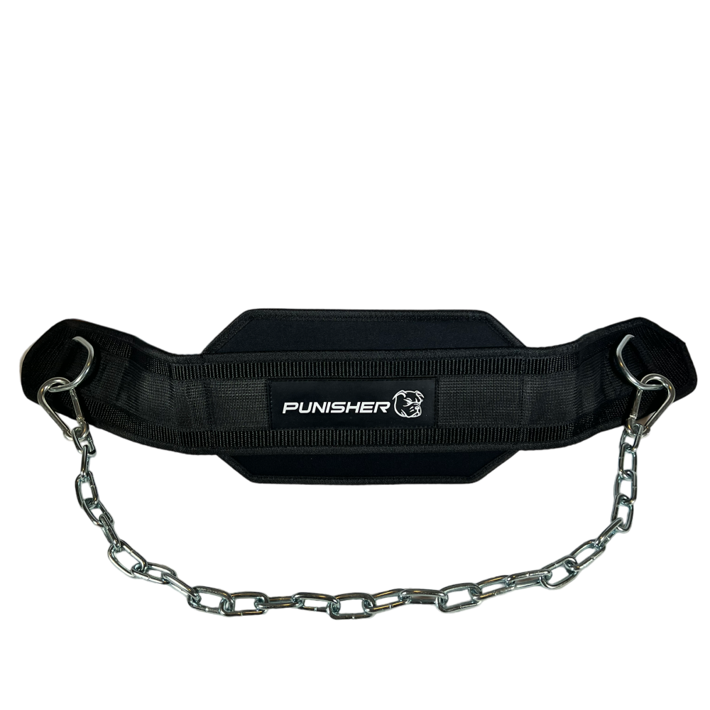 Punisher's Neoprene Dip Belt is designed to enhance your dip and pull-up exercises. Made from durable neoprene material, this belt offers comfort and support during your workouts. With its adjustable chain and carabiner, it allows you to add weight for increased resistance and muscle building.